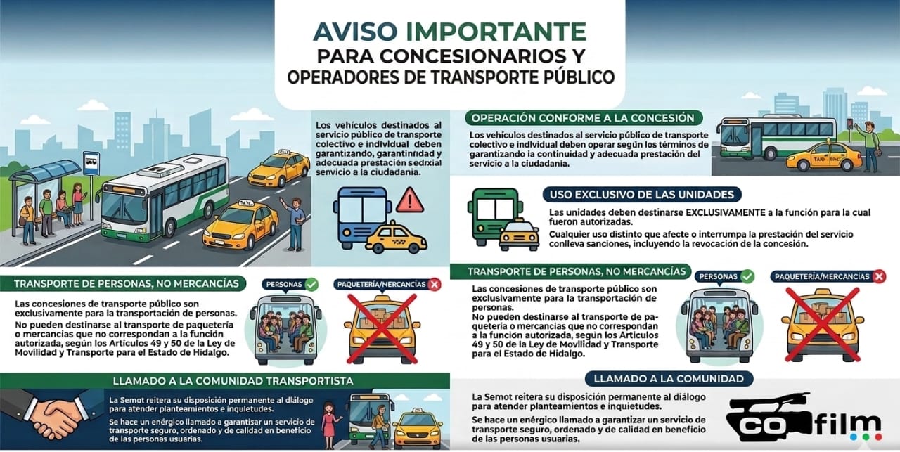 La Secretaría de Movilidad y Transporte (Semot), a través del Sistema de Transporte Convencional de Hidalgo (STCH), informa a todas las personas concesionarias y operadoras del servicio público de transporte.