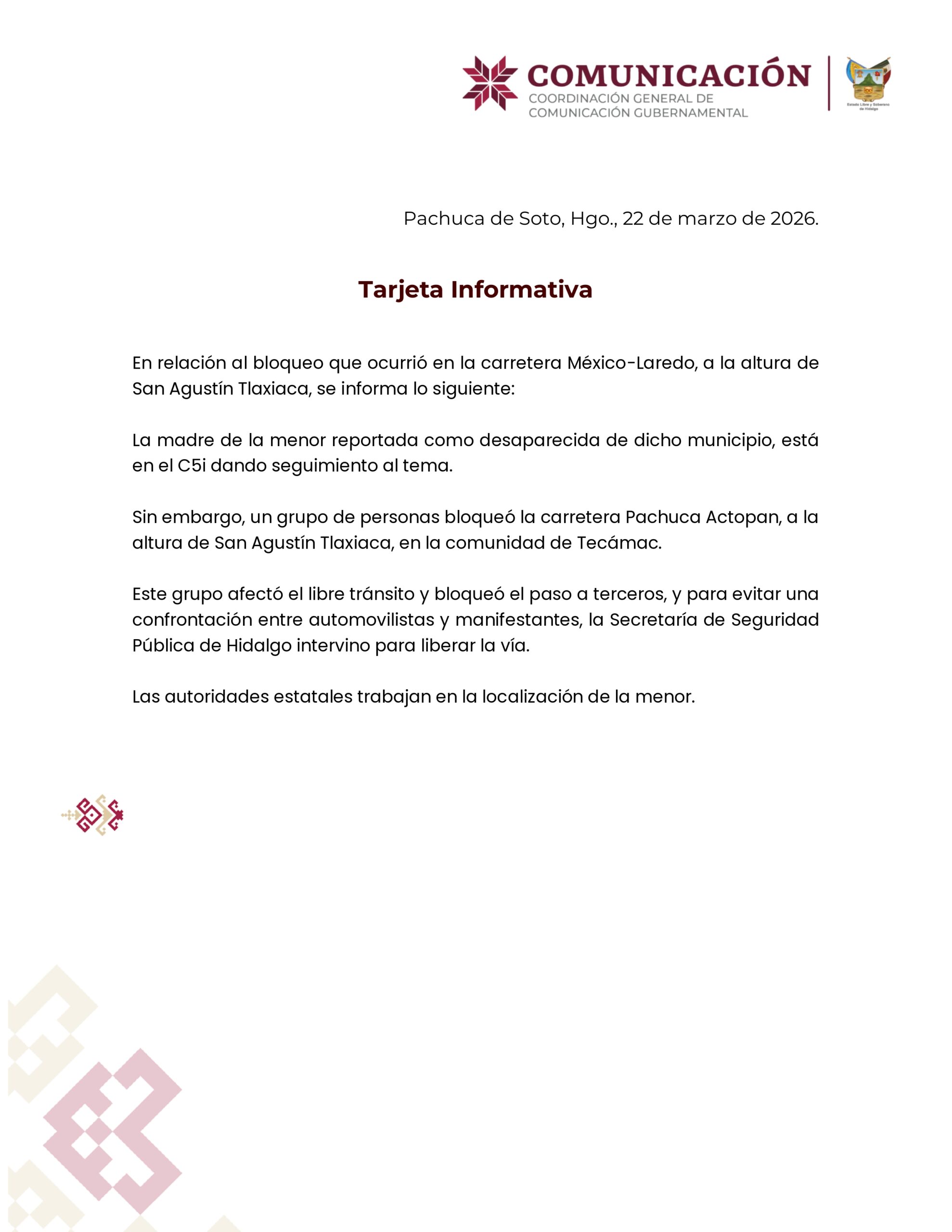 ⚠️ La protesta se originó por la desaparición de una menor en la región, mientras su madre se encuentra en el C5i Hidalgo dando seguimiento al caso.