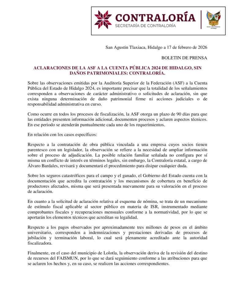 ⚠️ ACLARACIONES SOBRE LA CUENTA PÚBLICA 2024 DE HIDALGO: NO HAY DAÑOS PATRIMONIALES ⚠️ Ante las observaciones emitidas por la Auditoría Superior de la Federación (ASF), la Contraloría estatal ha hecho precisiones clave sobre la Cuenta Pública del estado correspondiente…
